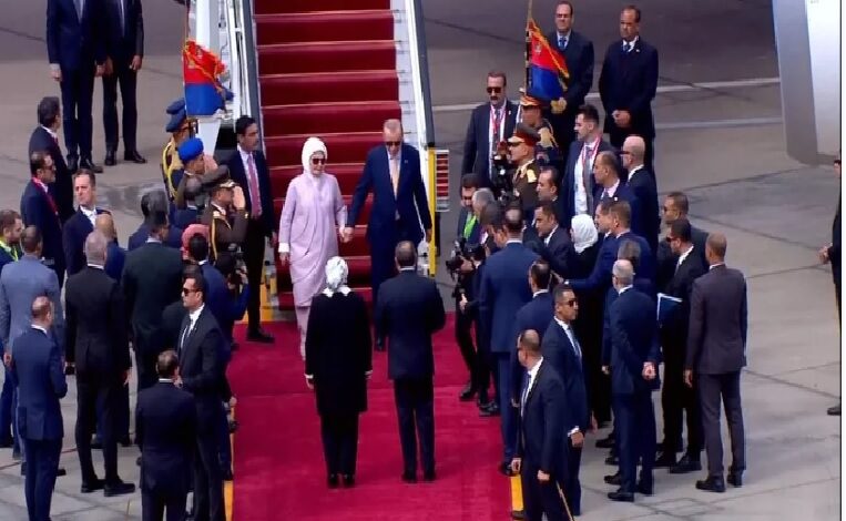وصل الرئيس التركي رجب طيب أردوغان وقرينته أمينة أردوغان إلى العاصمة المصرية، القاهرة، اليوم الأربعاء، وكان في استقبالهما الرئيس عبدالفتاح السيسي وقرينته انتصار السيسي.