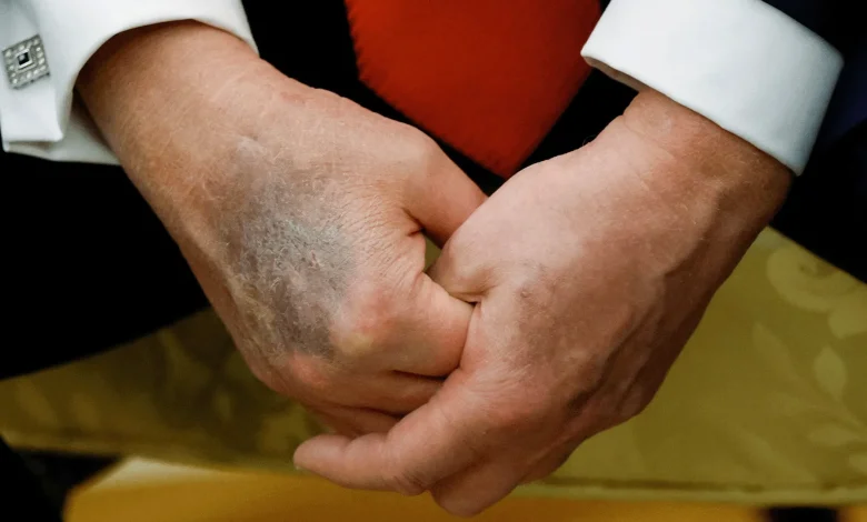 أثار ظهور كدمة على يد الرئيس الأمريكي دونالد ترامب جدلاً واسعاً على وسائل التواصل الاجتماعي، وتساؤلات حول صحته وقدرته على القيادة. وقد تصاعدت هذه التساؤلات بعد إقراره بتناول جرعات كبيرة من الأسبرين بشكل وقائي، على الرغم من عدم حاجة طبية لذلك. هذا الموضوع المتعلق بـصحة ترامب أصبح محور اهتمام إقليمي ودولي.