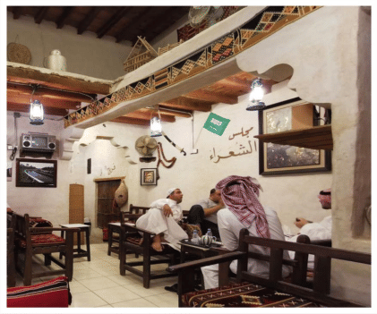 مع حلول المساء، رافقني معاذ إلى مقهى السيد الشعبي شرق الهفوف على مقربة من عين الخدود التي تتدفق مياهها بين النخيل[cite: 1]. الطريق إلى هناك يمر وسط بساتين تغمرها رائحة الرطب (التمر) ونسيم المساء الأحسائي العذب. يقول معاذ وهو يشير إلى الأفق: “المقهى ذا مو بس مكان، هو حكاية من حكايات الأحساء القديمة”. المقهى الذي صُمّم يدويًا بأكثر من 12 ألف قطعة أثرية من النحاسيات والفخاريات والأدوات التراثية، أصبح مقصدًا للزوار من مختلف مناطق المملكة والخليج. عند دخوله، تشعر أن الزمن توقف عند لحظة دفء قديمة، حيث تختلط رائحة القهوة السعودية بصوت فناجينها الرنانة.