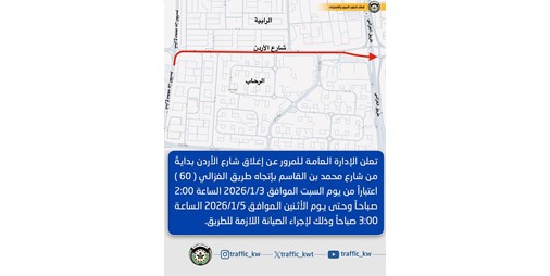 أعلنت الإدارة العامة للمرور عن إغلاق شارع الأردن بشكل جزئي ابتداءً من تقاطع شارع محمد بن القاسم وحتى طريق الغزالي (60) لمدة ثلاثة أيام، وذلك بهدف إجراء أعمال صيانة شاملة للطريق. سيبدأ الإغلاق يوم السبت الموافق 3 يناير 2026 في تمام الساعة 2:00 صباحاً، ويستمر حتى يوم الاثنين الموافق 5 يناير 2026 في تمام الساعة 3:00 صباحاً. يهدف هذا الإجراء إلى تحسين جودة الطريق وضمان سلامة مستخدميه.
