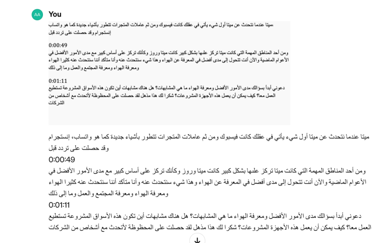 - وضعت أمرا في شات جي بي تي أن المواد التي تفرغ كنصوص تُترجم بشكل فوري للعربية إذا كان النص باللغة الإنجليزية، وبهذه الطريقة أضمن أن كل نصوص المواد باللغة العربية.