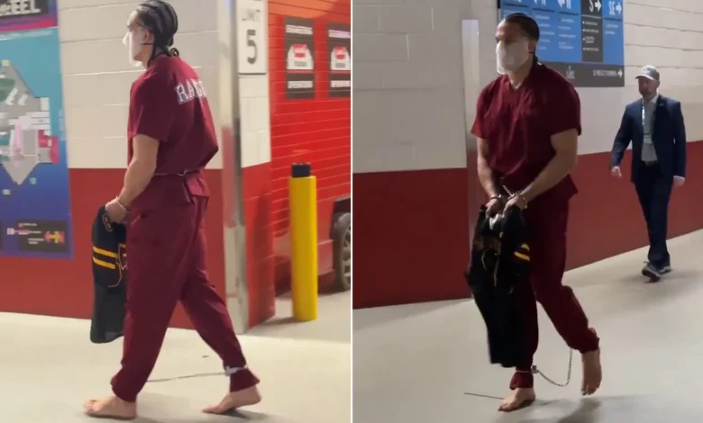 بالفيديو.. لاعب يرتدي زي السجناء ويكبل نفسه قبل مباراة السوبر بول وترمب يعلق