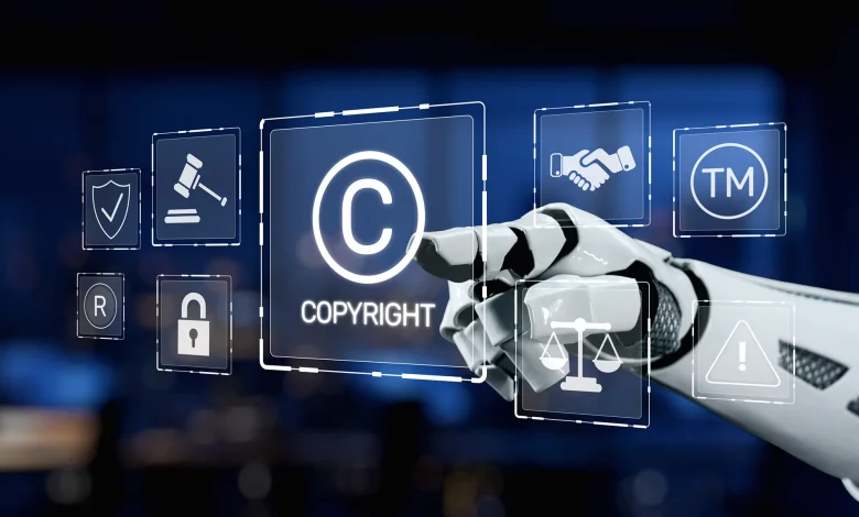 AI Image Rights and Media Law Scales of Justice Background with Photo Icon AI Sparkles Vector and Copy Space by sh99 @ادوبي ستوك