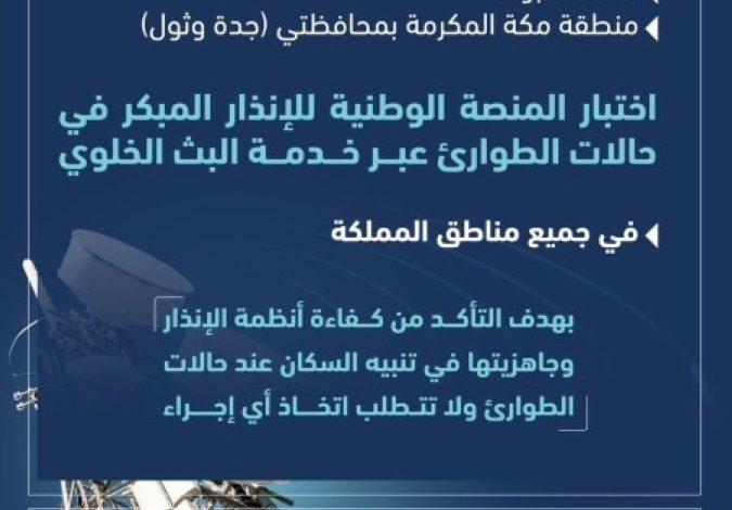 اختبار المنصة الوطنية (جميع مناطق المملكة): إرسال رسائل تحذيرية مميزة عبر البث الخلوي.