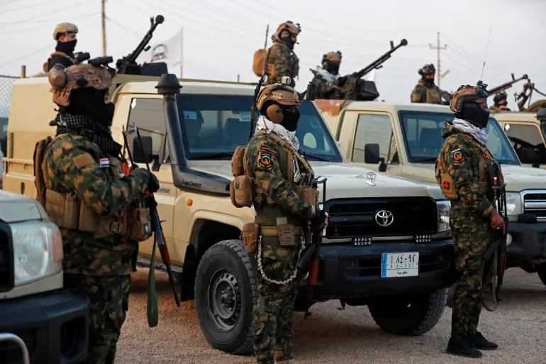 عناصر من قوات الحشد الشعبي حراساً في قاعدة عسكرية قرب الحدود العراقية السوري (الفرنسية)