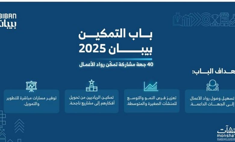 تشهد فعاليات ملتقى “بيبان 2025″، الذي تنظمه الهيئة العامة للمنشآت الصغيرة والمتوسطة “منشآت” خلال الفترة من 5 إلى 8 نوفمبر المقبل في مركز واجهة الرياض للمعارض والمؤتمرات، مشاركة (40) جهة ممكنة من القطاع الحكومي والخاص وغير الربحي ضمن “باب التمكين”، الذي يهدف؛ إلى تعزيز فرص النمو والنجاح لرواد الأعمال وأصحاب المنشآت الصغيرة والمتوسطة.