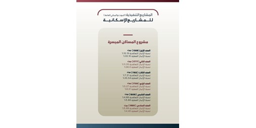 وأضافت: أما في مشروع المساكن الميسرة، فتتوزع نسب الإنجاز بين عدد من العقود، حيث حقق العقد الأول المكون من 1568 بيتا إنجازا فعليا بنسبة 30.16%، فيما سجل العقد الثاني لـ1777 بيتا نسبة فعلية 36.0%، وبلغ العقد الثالث لـ1162 بيتا نسبة إنجاز فعلية عند 35.54%، بينما حقق العقد الرابع لـ1700 بيت نسبة فعلية 6.01%، وتقدم العقد الخامس لـ1608 بيت بنسبة إنجاز فعلية بلغت 5.88%، في حين بلغ العقد السادس لـ1985 بيت نسبة إنجاز فعلية 4.40%.