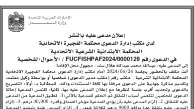إعلان مدعى عليه بالنشر لدى مكتب إدارة الدعوى محكمة الفجيرة الاتحادية