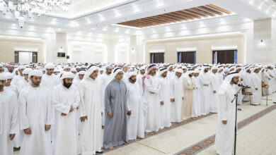 الشيوخ والجموع يؤدون صلاة الجنازة على جثمان حمد الخييلي في مدينة العين